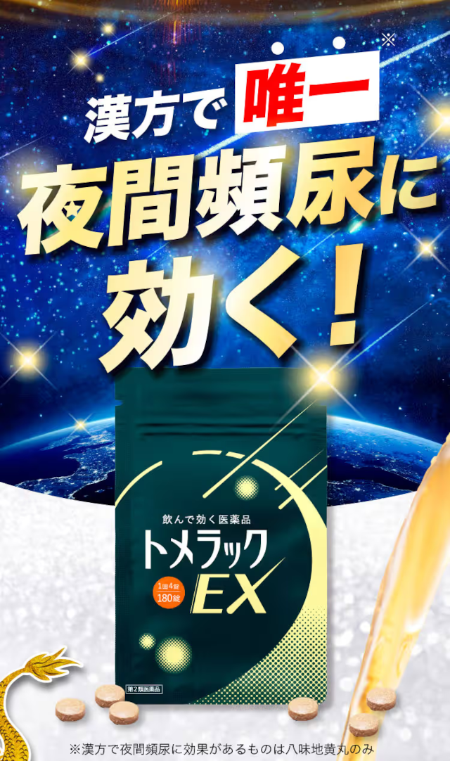 夜間頻尿に効能効果が認められた唯一の処方「八味地黄丸」を配合したトメラックEXなら、体質からの改善を目指すことができます。